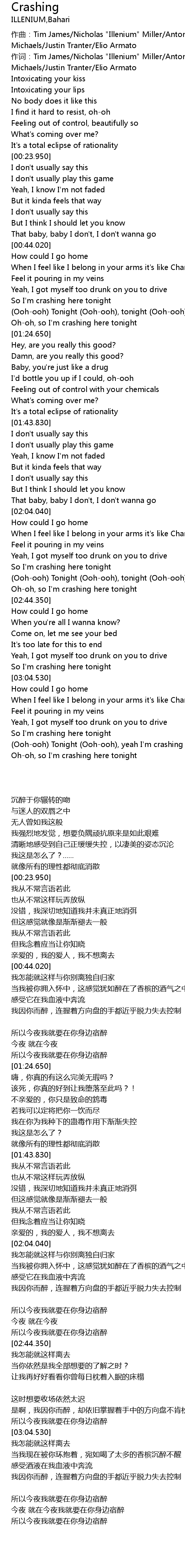 | [03:01.470] | So I' m crashing here tonight |