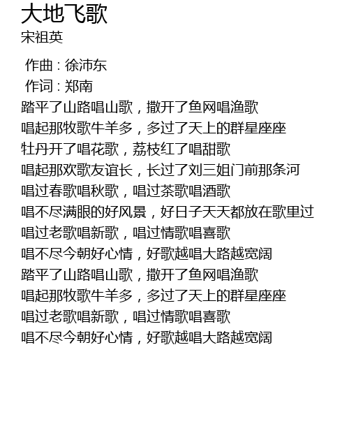 | [00:41.36] | 踏平了山路唱山歌,撒开了鱼网唱渔歌 |