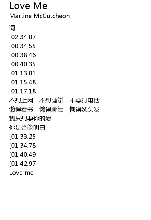 | [02:49.28][01:17.18][00:46.96] | Love me Love me Love me Love me |