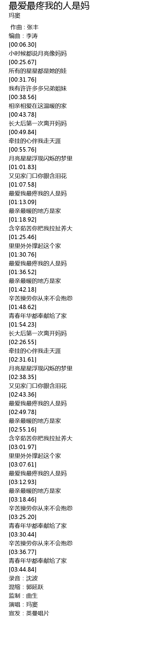 | [01:08.69] | zuì ài wǒ zuì téng wǒ de rén shì mā |