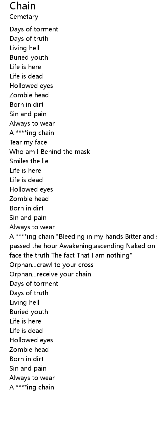| A ****ing chain "Bleeding in my hands Bitter and sour Lies the holy life Long passed the hour Awakening,ascending Naked on the floor In a cracked mirror I face the truth The fact That I am nothing" | |