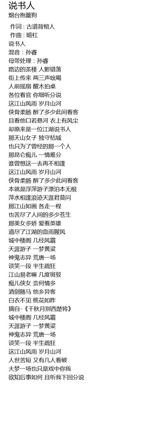 | [00:43.802] | que yuan lai shi yi wei jiang hu shuo shu ren |