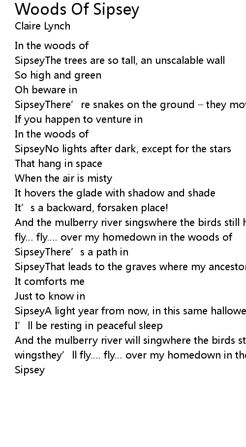 | And the mulberry river will singwhere the birds still have room for their wingsthey' ll fly. fly over my homedown in the woods of | |