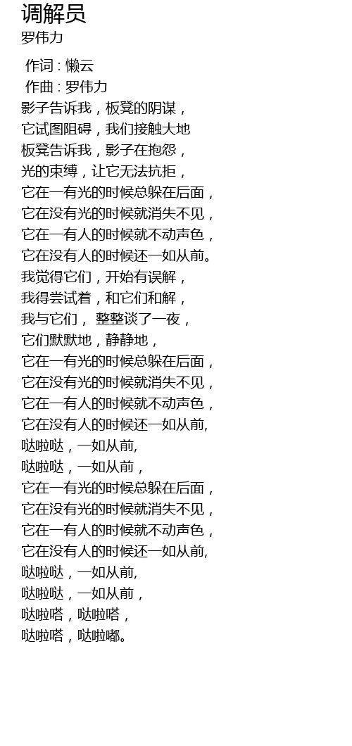| [00:49.438] | 板凳告诉我,影子在抱怨, |
