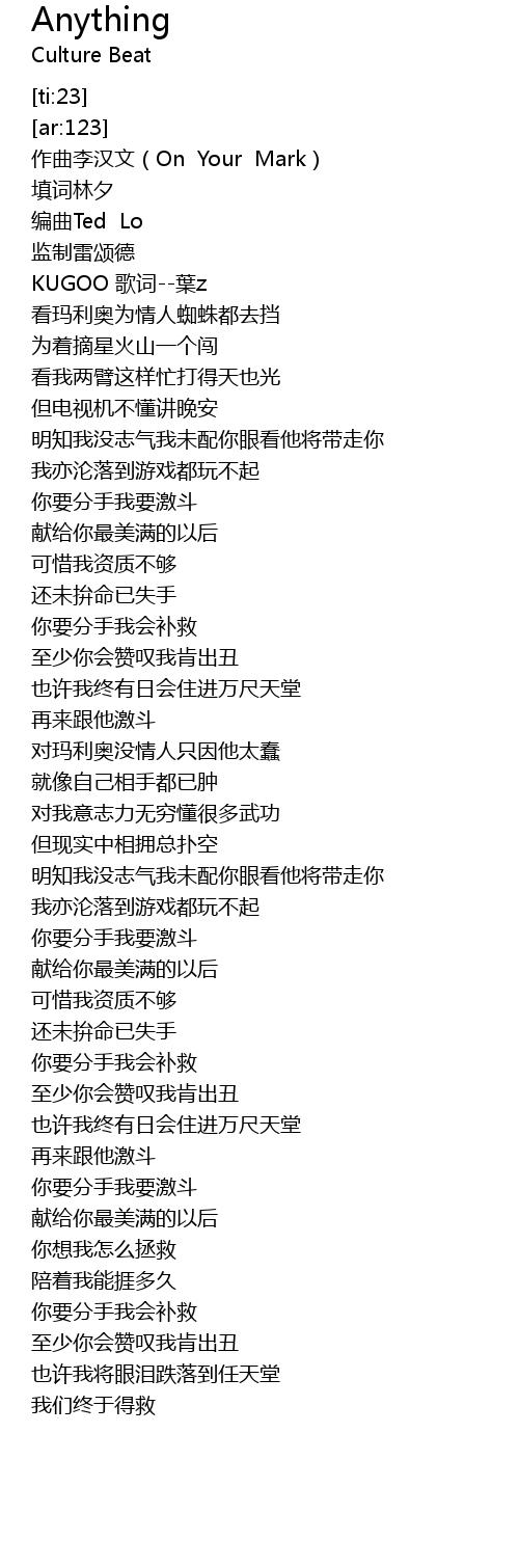 | [00:00.447] | 作曲李汉文(On Your Mark) |
