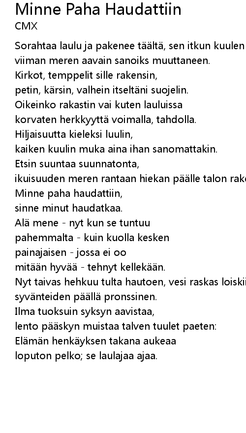 | Sorahtaa laulu ja pakenee t lt, sen itkun kuulen | |