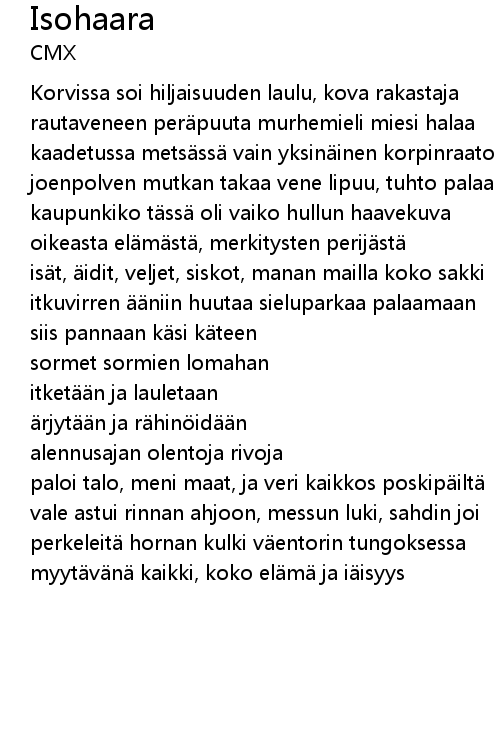 | itkuvirren niin huutaa sieluparkaa palaamaan | |