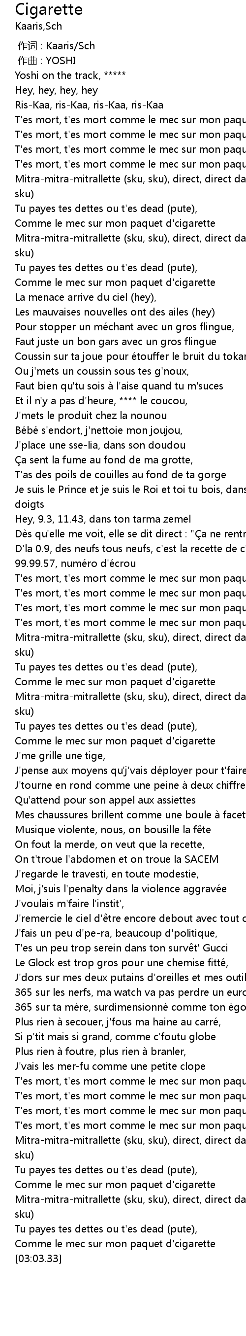 | [02:35.42] | T' es mort, t' es mort comme le mec sur mon paquet d' cigarette |