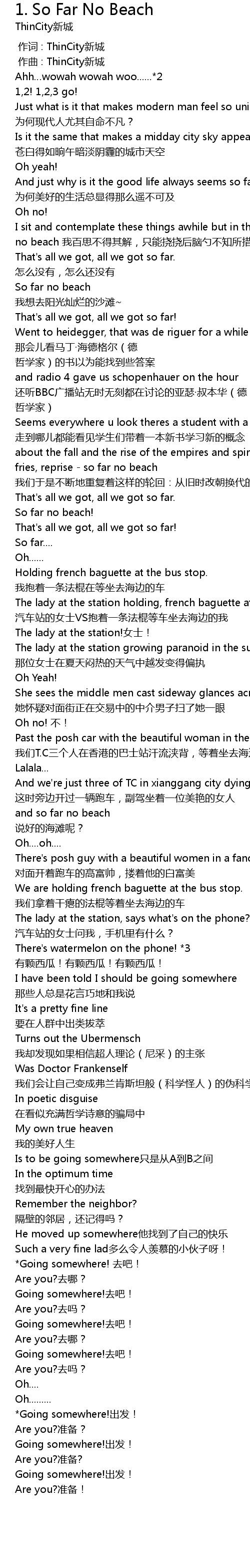 | [01:37.944] | about the fall and the rise of the empires and spires and spies and fries, reprise - so far no beach 我们于是不断地重复着这样的轮回:从旧时改朝换代的兴亡盛衰,到现代高楼拔地而起,最后东零西落的薯条堆 |