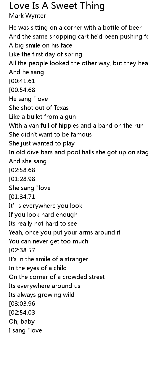 | [03:28.65][00:54.68][00:44.44] | Love is a sweet thing" |