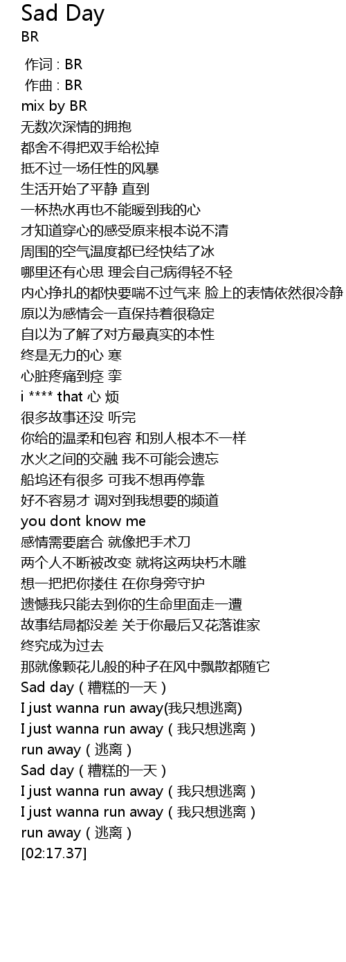| [02:09.25] | I just wanna run away wo zhi xiang tao li |
