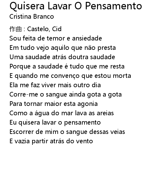 | Song | Quisera Lavar O Pensamento |