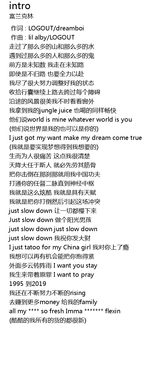 | [01:31.599] | all my **** so fresh Imma ******* flexin |