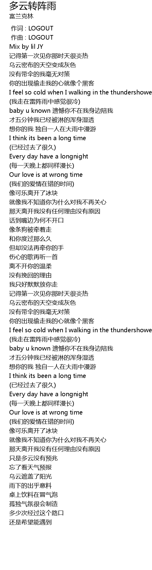 | [00:40.737] | (我走在雷阵雨中感觉很冷) |
