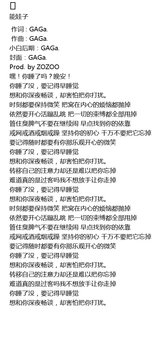 | [00:13.196] | 嘿!你睡了吗?晚安! |