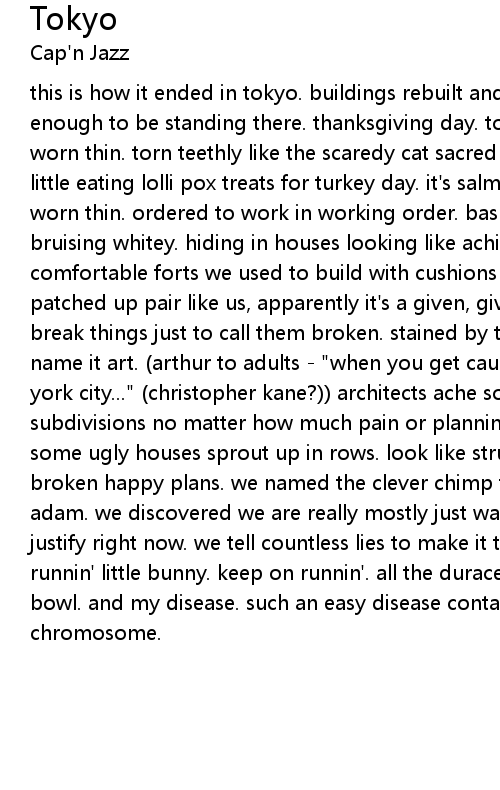 this is how it ended in tokyo. buildings rebuilt and billed to anyone dumb enough to be standing there. thanksgiving day. tossing eating wearing pigskin worn thin. torn teethly like the scaredy cat sacred custom goes. sweet chicken little eating lolli pox treats for turkey day. it's salmonella city. where we're worn thin. ordered to work in working order. bashful red shame and bold blue bruising whitey. hiding in houses looking like aching smiling faces. an oh, the comfortable forts we used to build with cushions and blankets. matching a patched up pair like us, apparently it's a given, given culture and all, we will break things just to call them broken. stained by this compulsion to ruin and name it art. (arthur to adults - "when you get caught between the moon and new york city..." (christopher kane?)) architects ache so they build. some subdivisions no matter how much pain or planning. no matter how much it matters. some ugly houses sprout up in rows. look like structures of sad accidents and broken happy plans. we named the clever chimp that picked up the first tool adam. we discovered we are really mostly just water. we pretend about a past to justify right now. we tell countless lies to make it through each day. keep on runnin' little bunny. keep on runnin'. all the duracell sold during the super bowl. and my disease. such an easy disease contagious as a yawn. my why chromosome. |