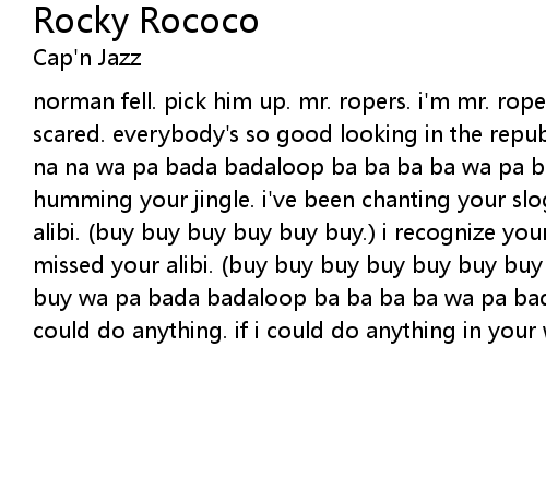 norman fell. pick him up. mr. ropers. i'm mr. roped. please don't push. i'm so scared. everybody's so good looking in the republic banana. (na na na na na na na na wa pa bada badaloop ba ba ba ba wa pa bada badaloop ba ba ba.) i've been humming your jingle. i've been chanting your slogan. but i must've missed your alibi. (buy buy buy buy buy buy.) i recognize your billboard. but i must've missed your alibi. (buy buy buy buy buy buy buy sell sell buy buy buy buy buy buy wa pa bada badaloop ba ba ba ba wa pa bada badaloop ba ba ba bye bye.) if i could do anything. if i could do anything in your world i'd be doing nothing. |