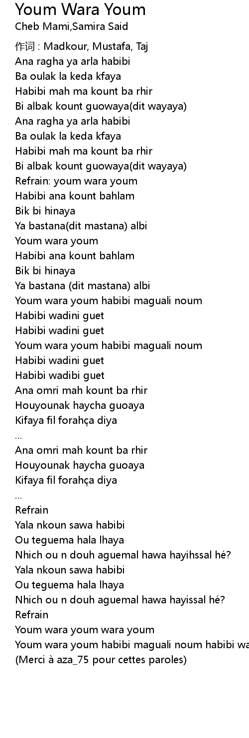 | Youm wara youm habibi maguali noum habibi wadini guet habibi wadini guet... | |