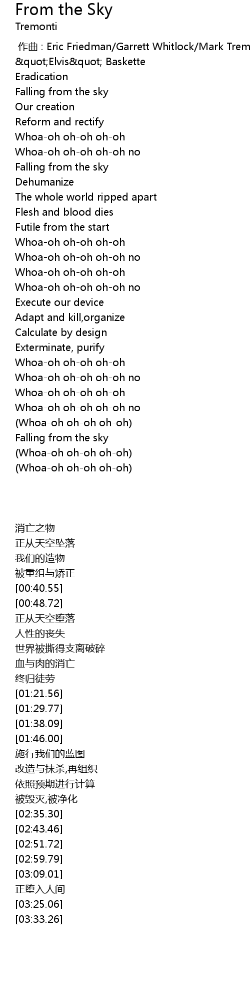 | [00:00.000] | 作曲 : Eric Friedman/Garrett Whitlock/Mark Tremonti/Michael "Elvis" Baskette |