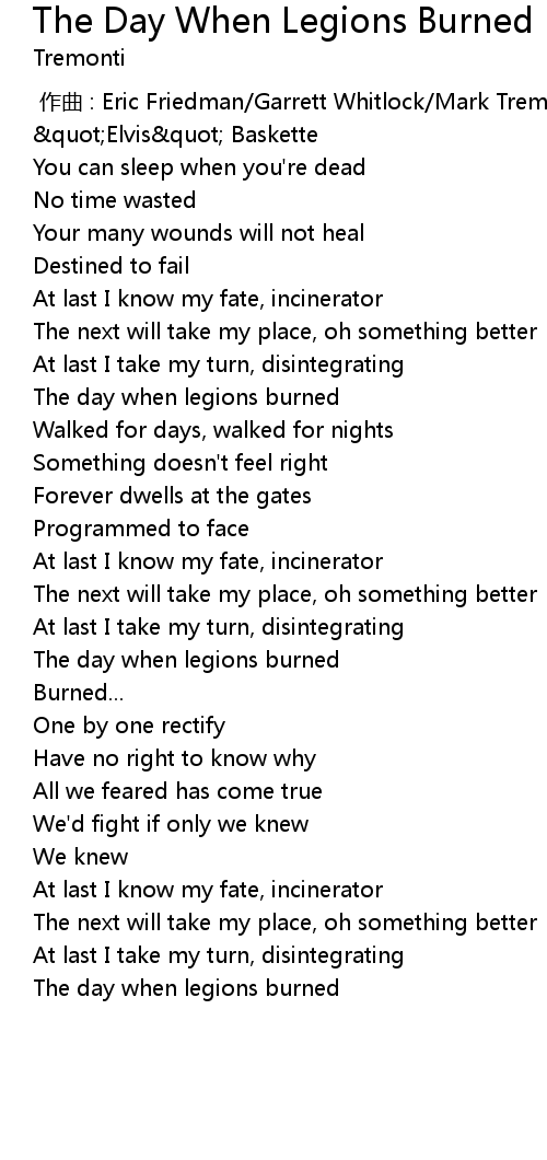 | [00:00.000] | zuo qu : Eric Friedman Garrett Whitlock Mark Tremonti Michael quot Elvis quot Baskette |