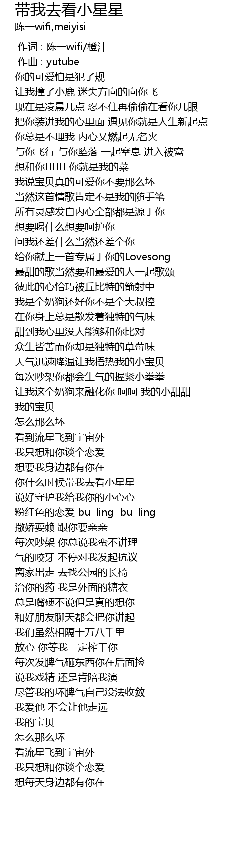 | [01:43.22] | nǐ shén me shí hòu dài wǒ qù kàn xiǎo xīng xīng |