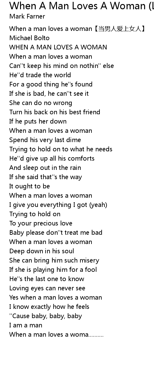 | [00:17.39] | WHEN A MAN LOVES A WOMAN |