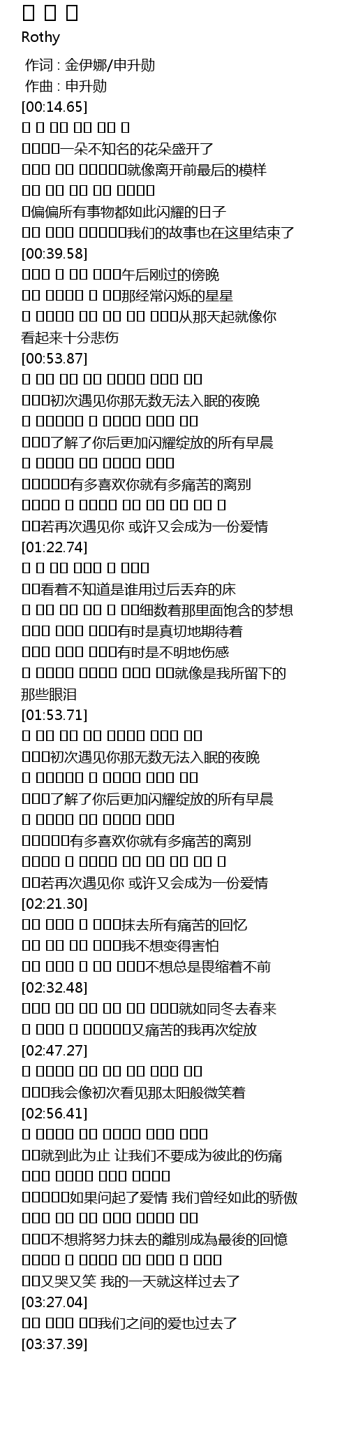 | [00:15.65] | 다 핀 어느 이름 모를 꽃 한송이의一朵不知名的花朵盛开了 |