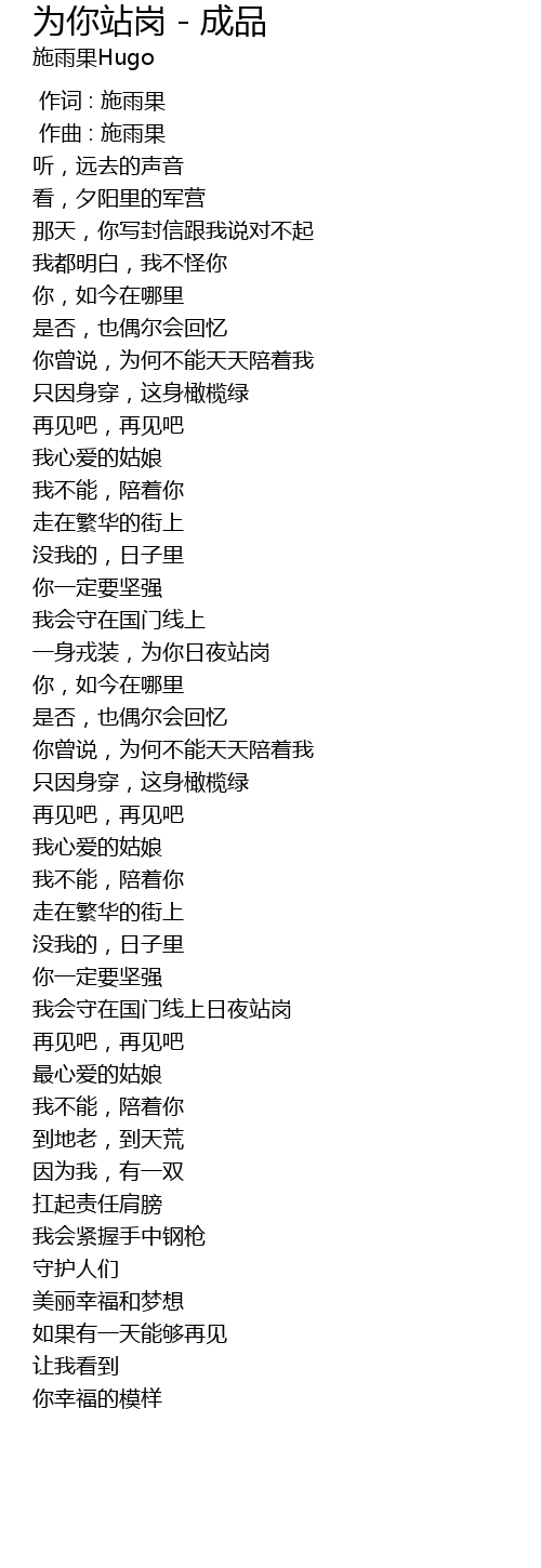 | [01:48.500] | 一身戎装,为你日夜站岗 |