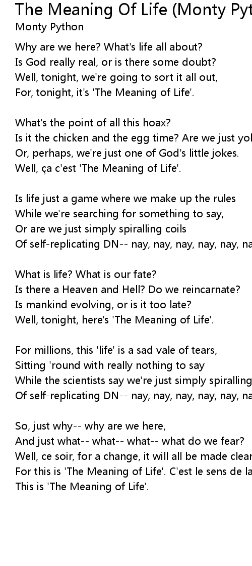 | Well, tonight, here's 'The Meaning of Life'. | |
