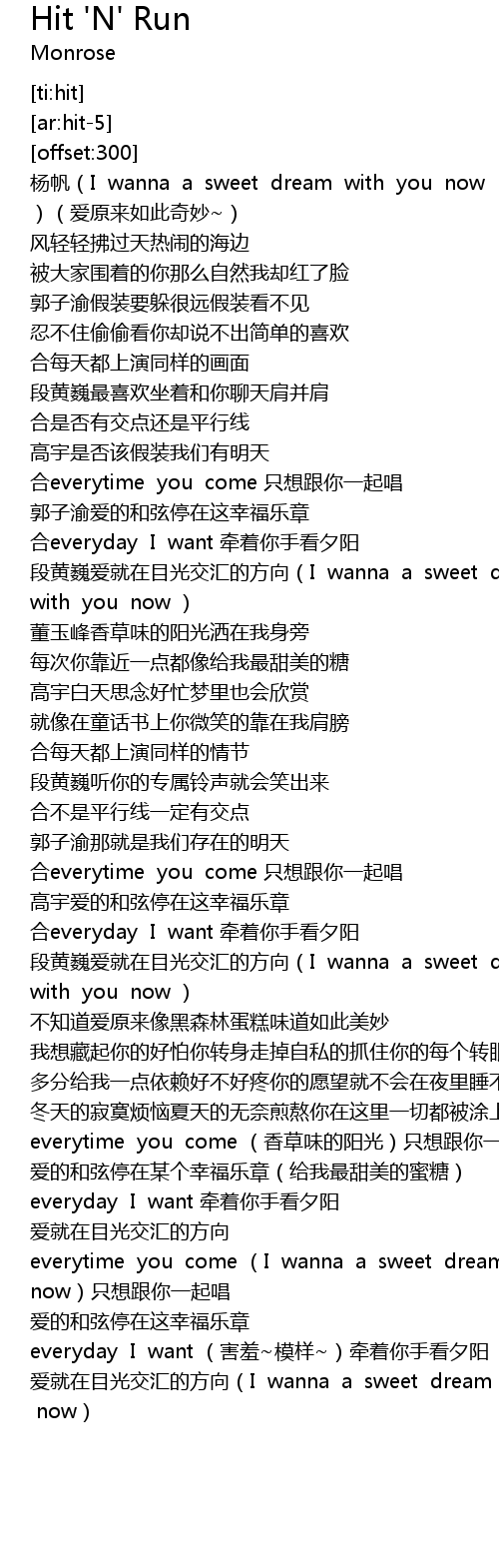 | [02:07.930] | 段黄巍爱就在目光交汇的方向(I wanna a sweet dream with you now ) |