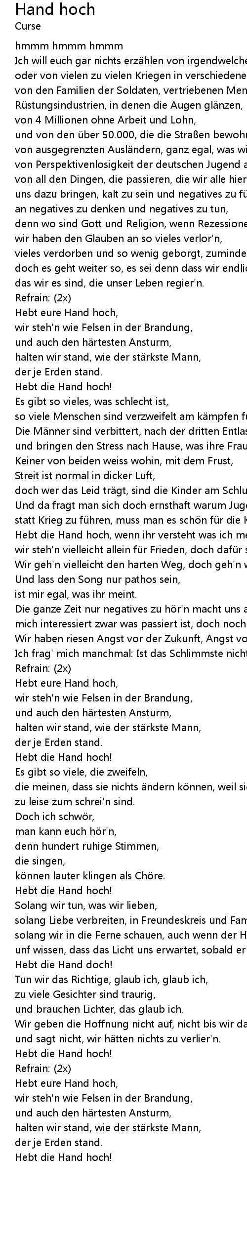 | Hebt die Hand hoch, wenn ihr versteht was ich mein', | |