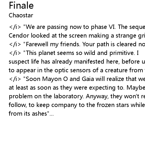 Cendor looked at the screen making a strange grimace as he pushed the button. [Cendor:]</i> "Farewell my friends. Your path is cleared now". [Mayon O:]</i> "At last we can move"! [Gaia:]</i> "This planet seems so wild and primitive. I suspect life has already manifested here, before us. I wonder how we are going to appear in the optic sensors of a creature from this place"? [Cendor thought:]</i> "Soon Mayon O and Gaia will realize that we won't bring them back, at least as soon as they were expecting to. Maybe they will think that we had a problem on the laboratory. Anyway, they won't remain alone. Soon millions will follow, to keep company to the frozen stars while a new Ahrem will be rebuilt from its ashes"... |
