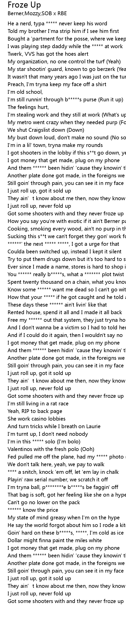 | [02:42.68] | I'm tryna ball, p********e b*****s be faggin' off |