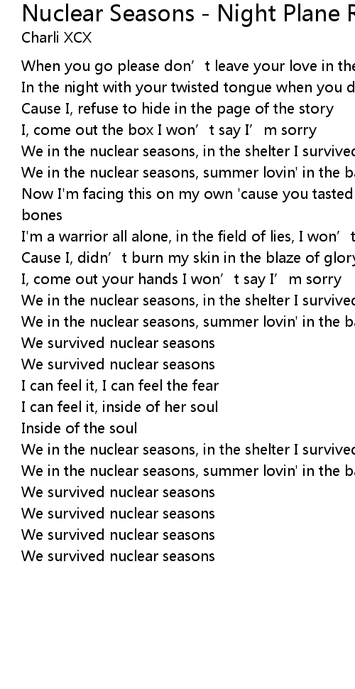 | We in the nuclear seasons, summer lovin' in the backseat gone | |