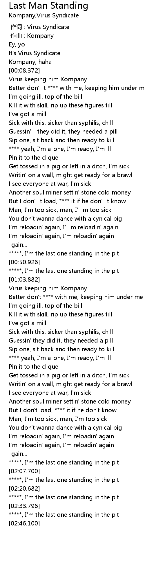 | [02:05.244] | *****, I'm the last one standing in the pit |