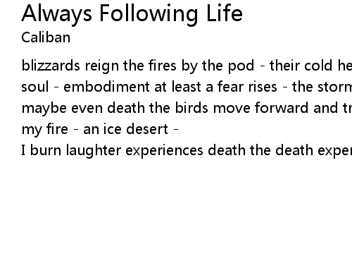 | blizzards reign the fires by the pod - their cold heat set ablaze my burning soul - embodiment at least a fear rises - the storm clams the choires forever - maybe even death the birds move forward and try to escape always following life my fire - an ice desert - | |
