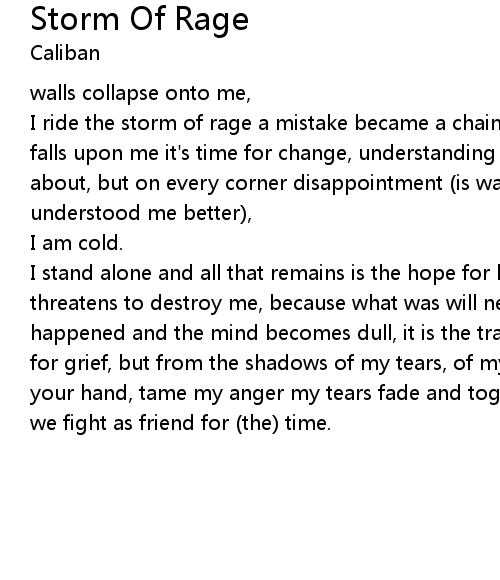 | I ride the storm of rage a mistake became a chain ?reaction and the reflection falls upon me it's time for change, understanding and faith are what friends are about, but on every corner disappointment (is waiting, every wall would have understood me better), | |