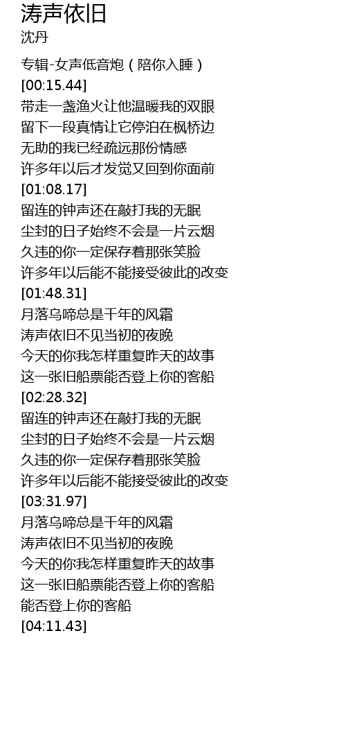 | [00:44.60] | 留下一段真情让它停泊在枫桥边 |
