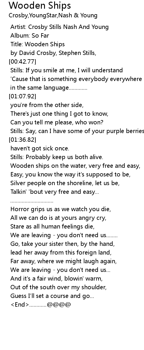 | [01:54.49] | Wooden ships on the water, very free and easy, |