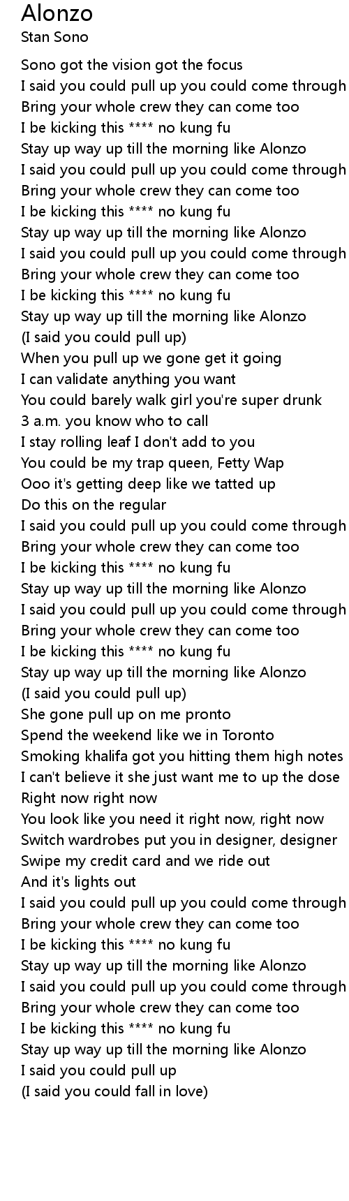 | [02:30.77] | Stay up way up till the morning like Alonzo |