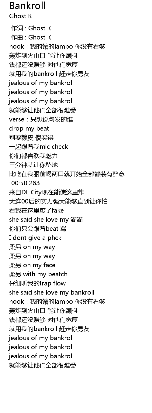 | [00:21.672] | 就用我的bankroll 赶走你男友 |