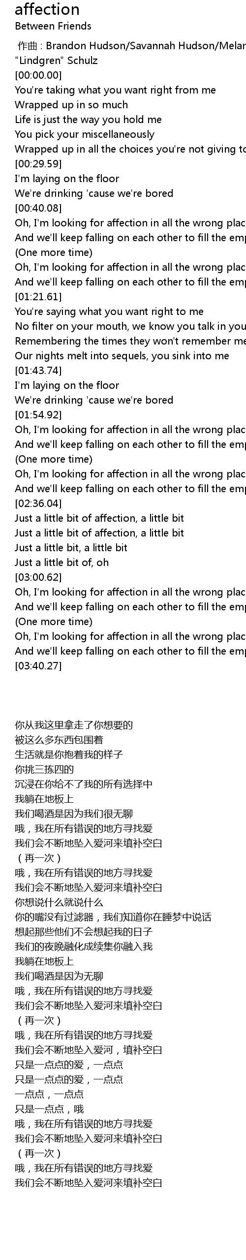 | [03:22.09] | Oh, I'm looking for affection in all the wrong places |