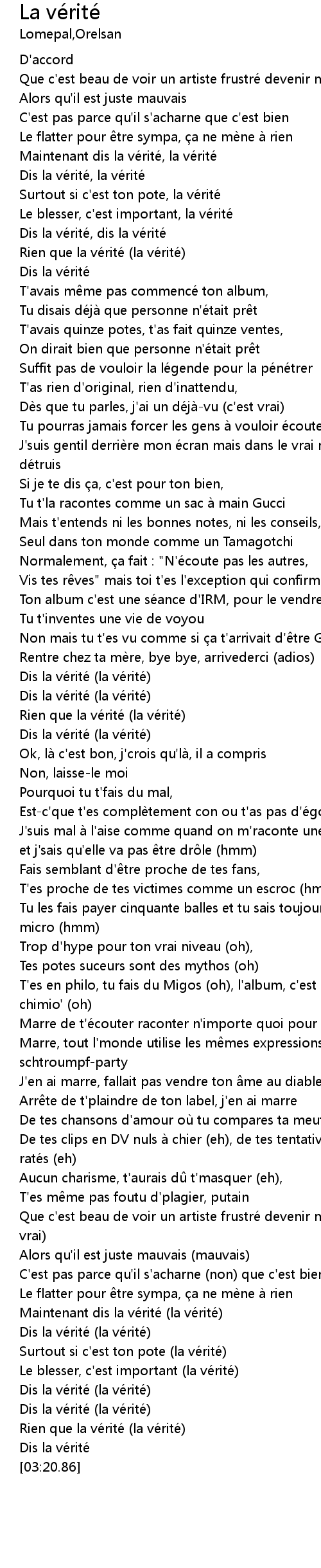 | [00:35.12] | Dis la ve rite, dis la ve rite |