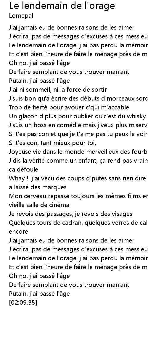 | [01:42.88] | Le lendemain de l' orage, j' ai pas perdu la mé moire |