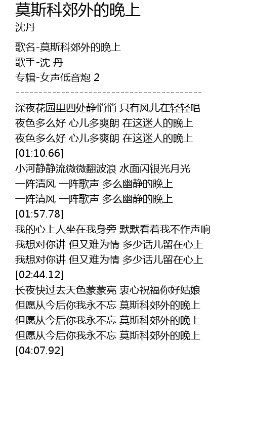 | [03:54.74] | 但愿从今后你我永不忘 莫斯科郊外的晚上 |