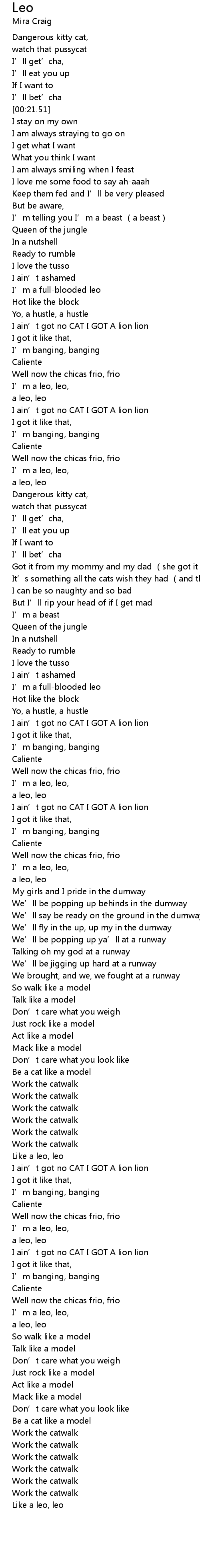 | [03:20.68] | I ain’t got no CAT I GOT A lion lion |