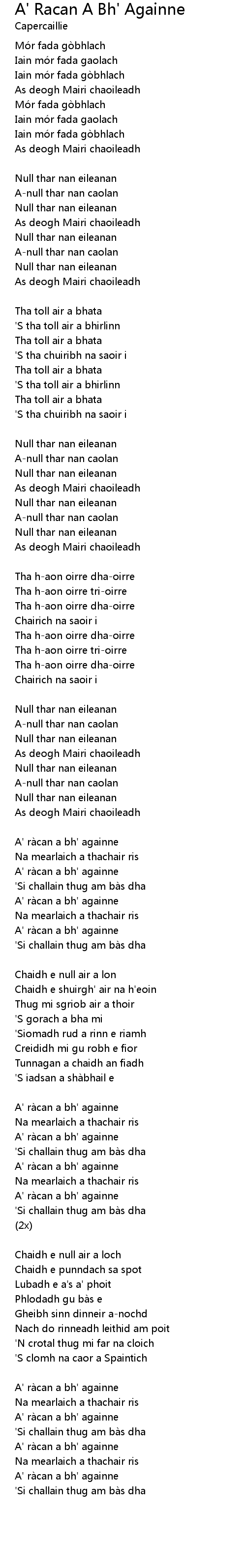 | Song | A' Racan A Bh' Againne |