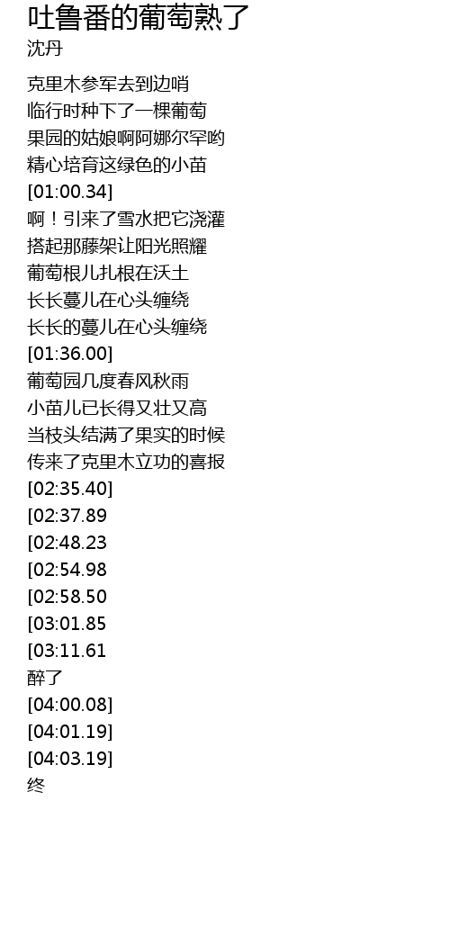 | [03:32.86][02:54.98] | 吐鲁番的葡萄熟了 |
