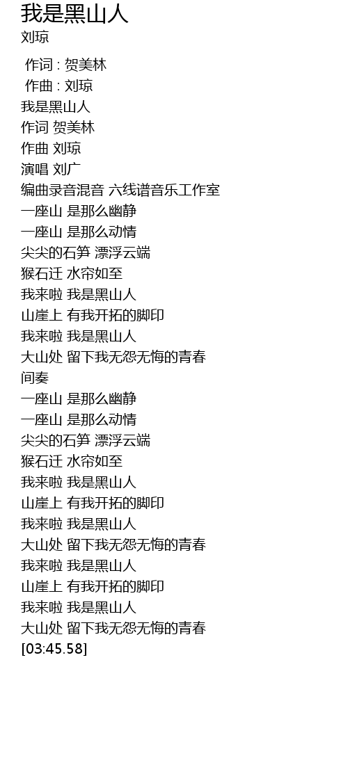 | [03:25.37] | wǒ lái la wǒ shì hēi shān rén |