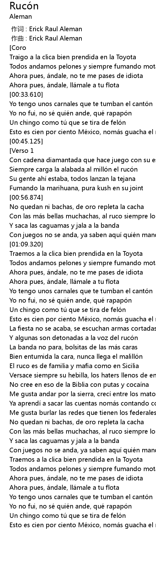 | [02:33.960] | Yo tengo unos carnales que te tumban el cantón |